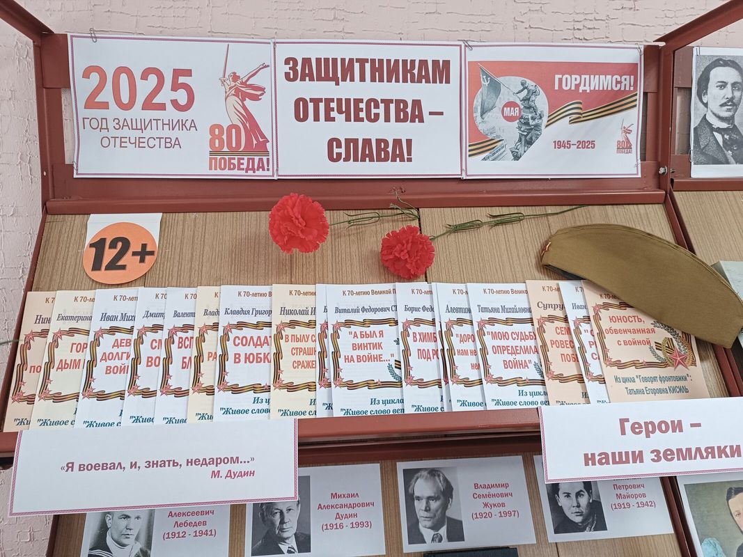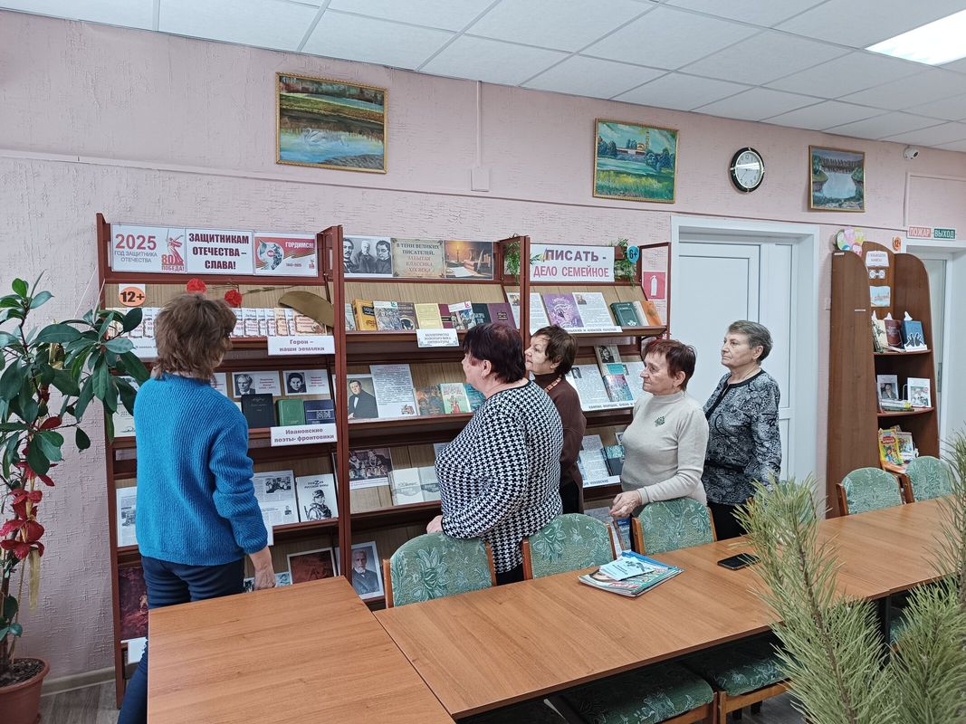 В преддверии Дня защитника Отечества в читальном зале библиотеки оформлена книжно-иллюстративная выставка «Защитникам Отечества – слава!». На ней представлена краеведческая литература о наших земляках, участниках Великой Отечественной войны, поэзия ивановских поэтов М. Дудина, Н. Майорова, В. Жукова и А. Лебедева. Раздел «Художник в военной шинели» посвящен художнику-баталисту П. Кривоногову, чье имя связано с Ивановским краем. Также здесь представлена информация о земляках - героях СВО, которые погибли при исполнении долга.