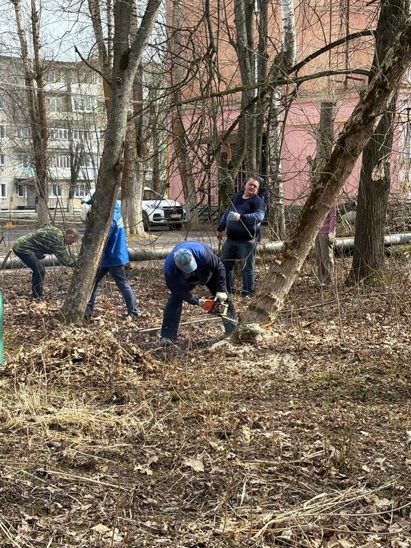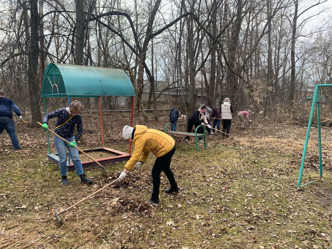 Сотрудники администрации убрали мусор, прошлогоднюю листву, вырубили кустарники на территории детской площадки в микрорайоне «Литера»