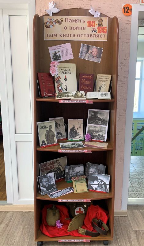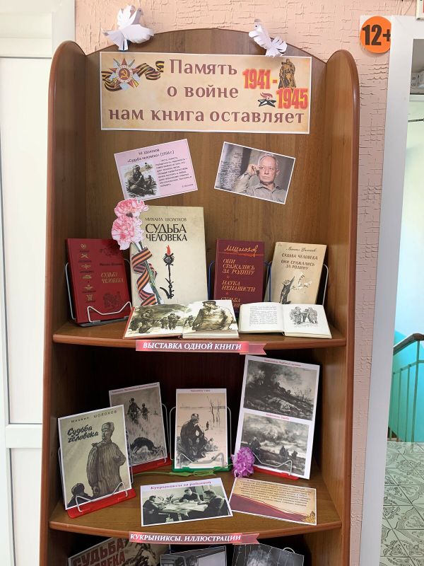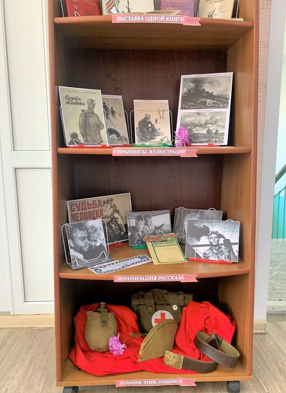 Одна из выставок – «Память о войне нам книга оставляет» - посвящена рассказу М.А. Шолохова «Судьба человека». Выставка одной книги рассказывает об истории создания произведения, его разных изданиях, воплощении в изобразительном искусстве и кино.