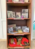 Завершает экспозицию небольшая инсталляция, посвященная защитникам Родины: на красном полотнище солдатские пилотка, фляжка, ремень; гвоздики, голуби, символизирующие мир, и открытки, сделанные руками юных читателей.