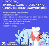 Факторы, которые приводят к развитию эндокринных нарушений: опухоли тканей железы, кисты, инфекционные заболевания, наследственный фактор, хронические заболевания других органов и систем, сердечно-сосудистая недостаточность, хирургические вмешательства, прием ряда препаратов. Так как гормоны, вырабатываемые железами внутренней секреции, регулируют работу других органов и систем, то при эндокринных заболеваниях нарушается обмен веществ и возникают симптомы, характерные, например, для заболеваний кожи, почек и т.д.