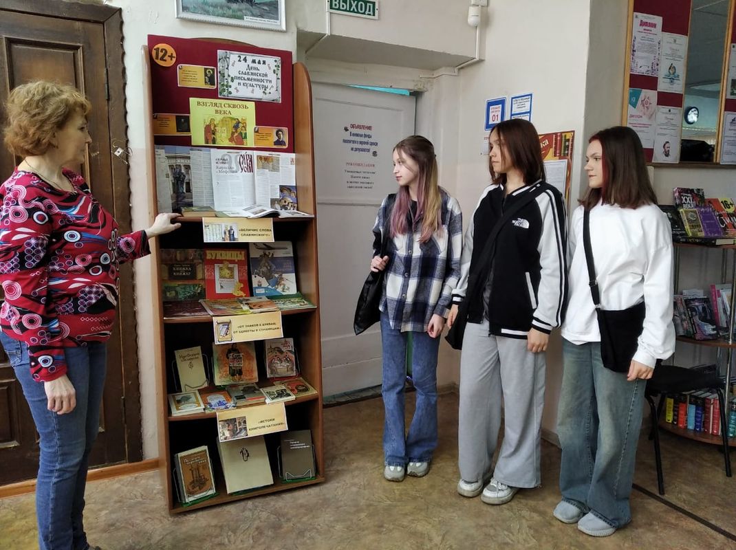 Также к этому событию на абонементе библиотеки была оформлена информационная выставка «Взгляд сквозь века» которая предлагает всем желающим окунуться в мир наших предков. Она знакомит с историей письма и информирует об интересном и непростом пути книжного дела с древних времён до наших дней.