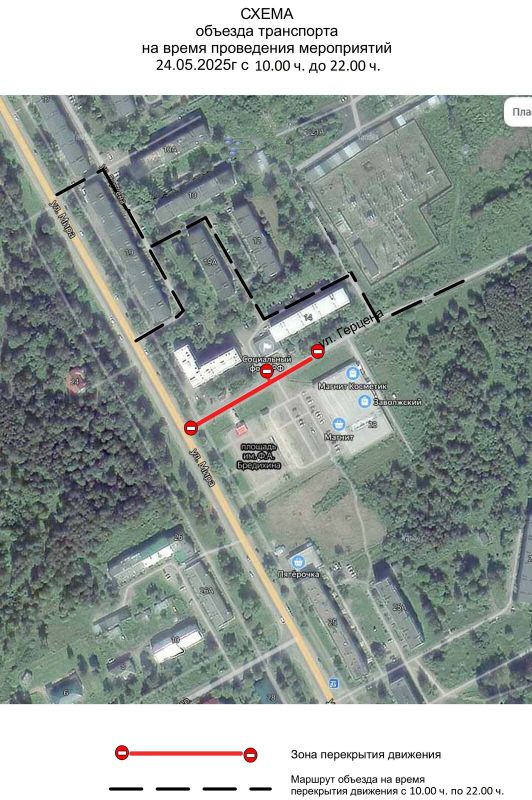 - с 12.00 до 22.00 проезд по ул. Герцена (дорога на кладбище), от пересечения с ул. Мира до дома №14 по ул. Герцена, по проезду между домами № 21 по улице Мира и домом № 14 ул. Герцена.