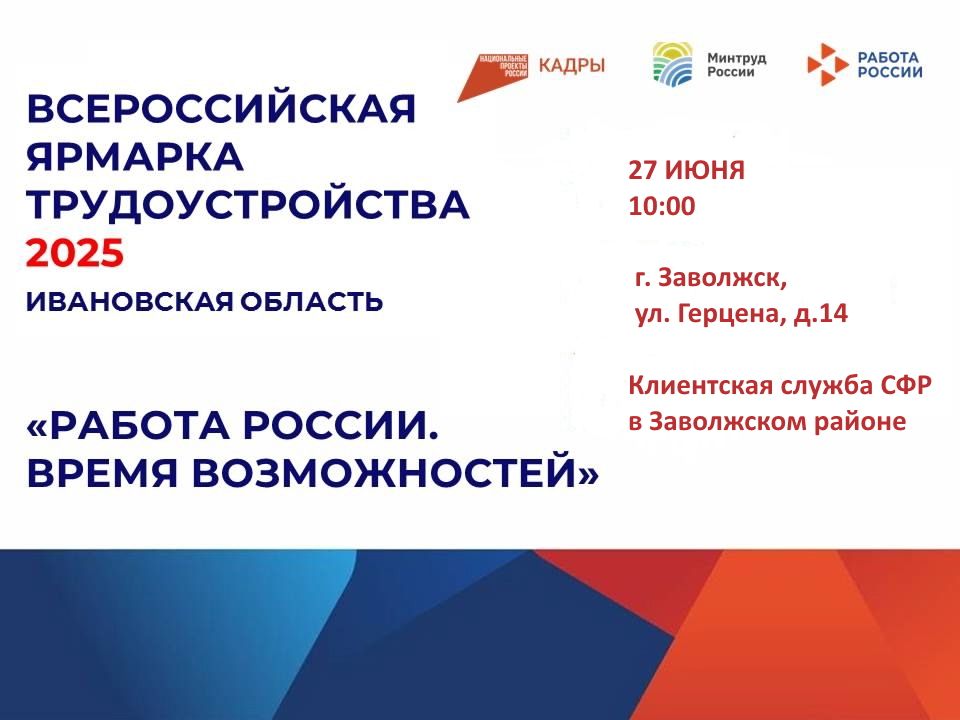 27 июня 2025 года жители Заволжского муниципального района смогут найти подходящую для себя работу  на федеральном этапе Всероссийской ярмарки трудоустройства «Работа России. Время возможностей».