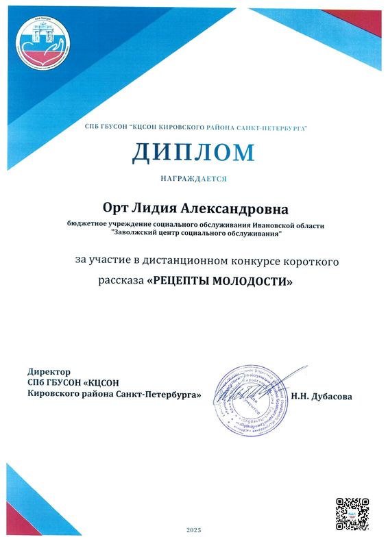 Заволжский центр социального обслуживания в рамках национального проекта «Семья» федерального проекта «Старшее поколение» представил на Конкурс работу Лидии Александровны Орт под названием: «Жить, гореть и не угасать. Жить, а не существовать!» В своем рассказе она описала, как после продолжительной болезни, преодолев всё, она вернулась к активной жизни. Сейчас в ОБУСО «Заволжский ЦСО» Лидия Александровна руководит театральной студией «Маска» и шумовым оркестром «Вечерний звон», пишет сценарии к праздничным мероприятиям, организовала и проводит занятия в женском клубе «Мир эстетики и этикета», участвует в областных фестивалях и акциях. «Самое главное – я теперь не «Инвалид»! Я – «Серебряный» волонтер» - так, в завершении своего рассказа написала Лидия Александровна.