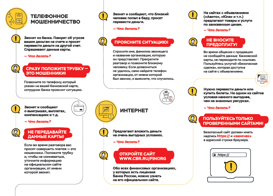 Напоминаем вам о важности осторожности в интернете и при общении с незнакомыми людьми. В последнее время наблюдается тревожная тенденция роста мошенничества. Мы подготовили специальные карточки с основными признаками мошеннических действий, чтобы помочь вам защитить себя и своих близких.