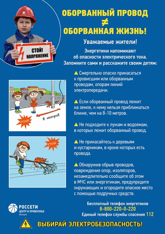 6.Безопасное расстояние до оборванного провода – не менее 8 метров. Оказавшись ближе, человек подвергается смертельной опасности. Не приближайтесь к оборванным проводам!