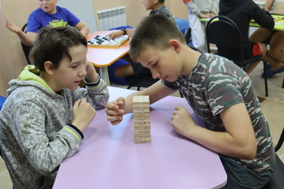 В начале дня ребята разделились на группы и приняли участие в турнирах по шахматам, шашкам и настольной игре «Дженго». В перерывах ребята с удовольствием разгадывали кроссворды и занимались раскраской.