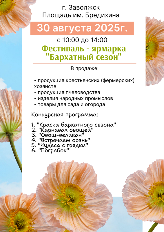 Приглашаем вас на яркое событие, приуроченное к окончанию лета — Фестиваль-ярмарку "Бархатный сезон". Мероприятие состоится 30 августа с 10:00 до 14:00 на площади имени Бредихина. Погрузитесь в атмосферу наступающей осени и насладитесь богатым урожаем, который подарила нам эта великолепная пора года.