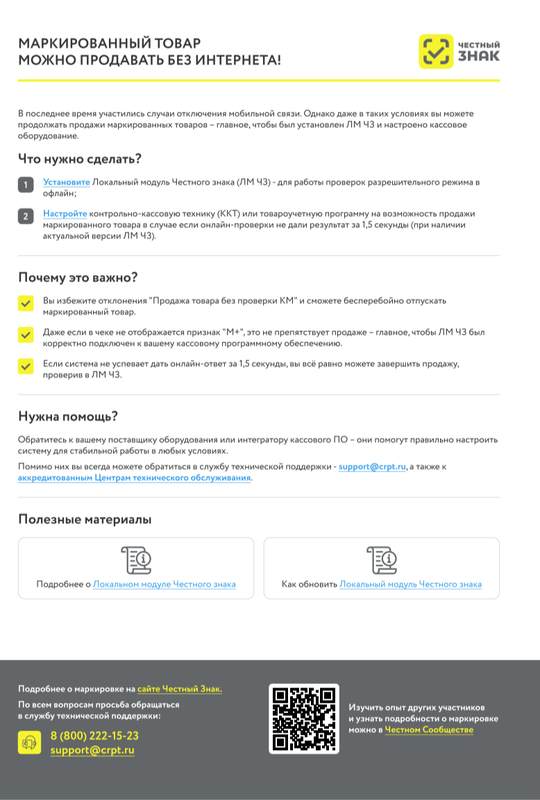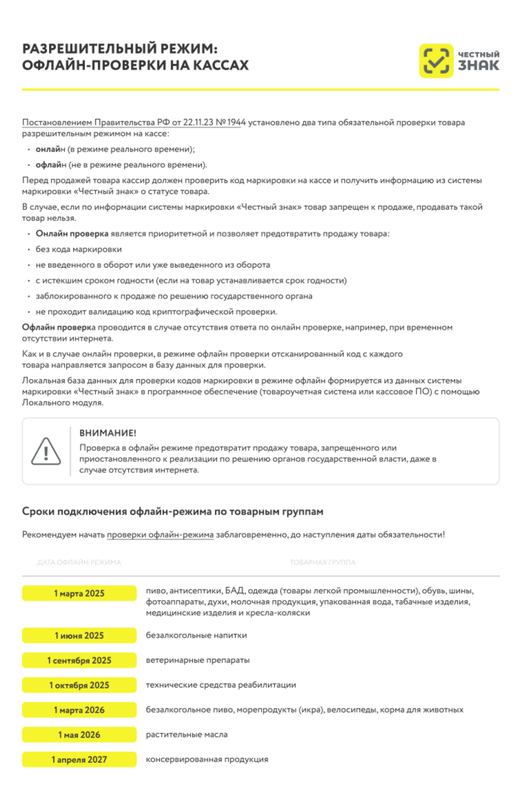 С 1 марта 2025 года стало обязательной проверка маркировки в офлайнрежиме для 13 групп товаров. Во исполнение поручения заместителя Министра промышленности и торговли Российской Федерации Е.Г. Приезжевой, направляем информационные материалы по разрешительному режиму: офлайн-проверки на кассах, а также приложение ссылку на сайт: https://markirovka.ru/community/rezhim-proverok-nakassakh/rezhim-proverok-nakassakh.