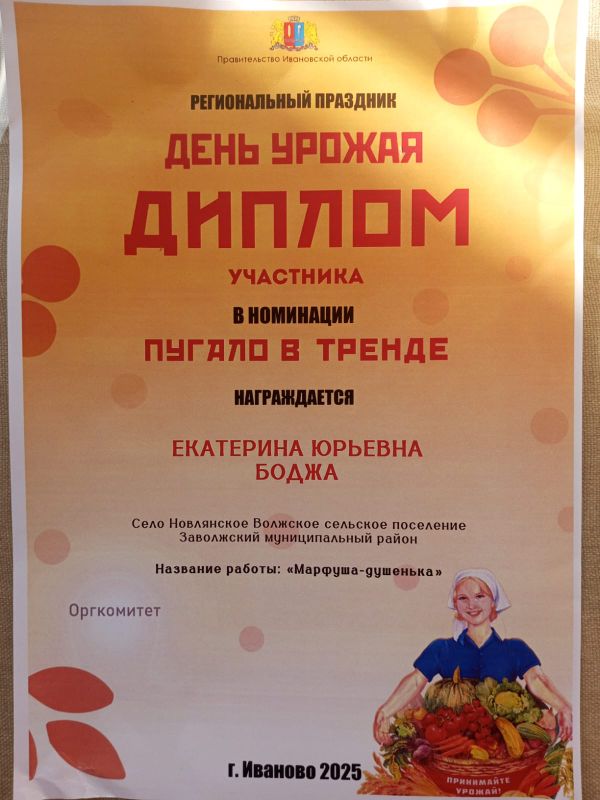На «Дне урожая» также подвели итоги конкурсов. Умельцы продемонстрировали результаты своего труда на выставках декоративно-прикладного искусства, таких как «Пугало в тренде», «Чудо огородное» и «Чудесные дары осени». Наша землячка из Волжского сельского поселения получила диплом в одной из номинаций.