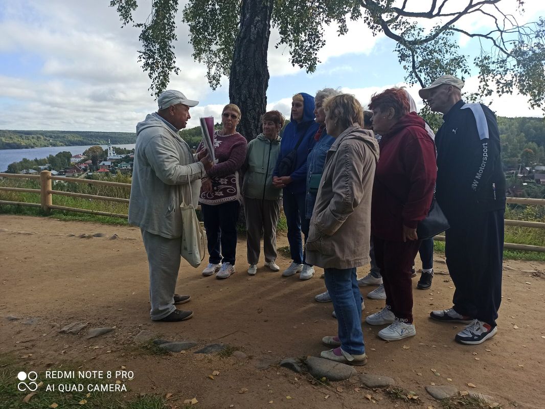 Первая группа, в составе которой были участники танцевального коллектива «Заволжаночка», театральной студии «Маска» и группы здоровья «Движение – эликсир долголетия», начала свой маршрут на «Соборной горе», где их встречал гид Андрей Владимирович. Он так выразительно описывал «Левитановский Плес», что все участники завороженно слушали его и любовались красивейшим видом города с высоты почти 60 метров над уровнем Волги. Кроме рассказа Андрей Владимирович показывал фото известных картин Левитана и показывал места, изображенные на его картинах.