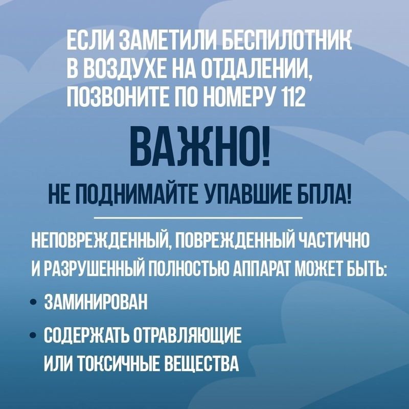 3. Если вы обнаружили беспилотное воздушное судно на земле, не приближайтесь к нему, не трогайте руками и не пытайтесь уничтожить. Не пользуйтесь мобильным телефоном рядом с местом падения.