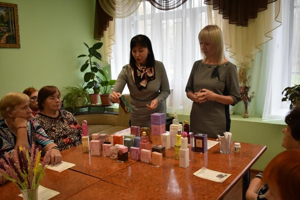 Затем руководители клуба, волонтеры «серебряного» возраста – Лидия Александровна Орт и Тамара Павловна Курочкина познакомили участниц с правилами использования парфюмерии и подбором ароматов.