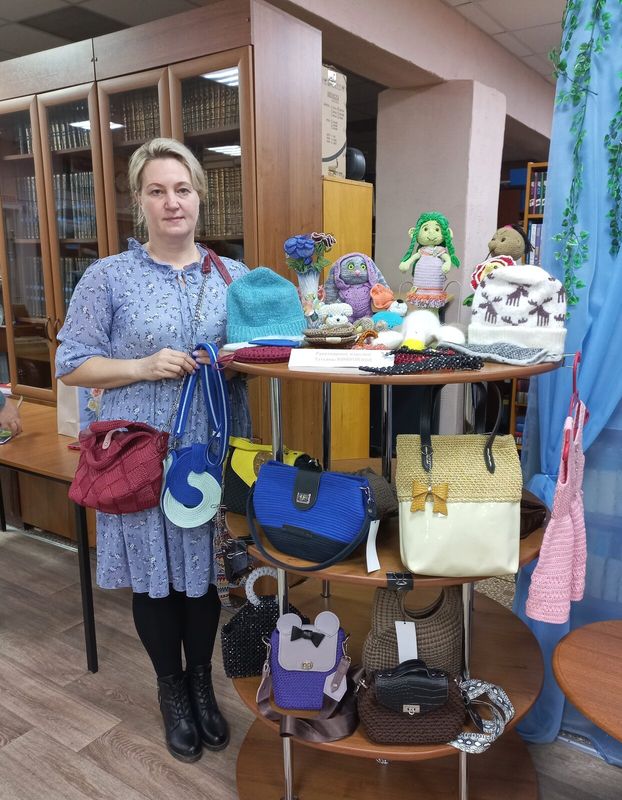 Много радостных минут доставило знакомство с героиней встречи -Татьяной Коноплевой, которая искусно вяжет спицами и крючком забавные игрушки, сувениры, шапки, варежки, украшения. Но больше всего зал покорили её вязаные сумочки, которые красиво продемонстрировали сотрудницы библиотеки во время музыкального дефиле. Разного цвета и фасона, праздничные и повседневные – на любой вкус. Татьяна поделилась секретами творчества, отметила, что занимается вязанием с детских лет и всегда стремится осваивать все новое. Теплые слова о скромной заволжской мастерице, своей подруге, сказала сотрудница библиотеки Оксана Черемушкина, которую увлекла рукоделием именно Татьяна.