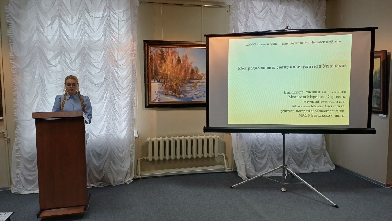 место - Маргарита Межакова, обучающаяся 10-а класса Заволжского лицея. Тема работы: «Моя родословная: священнослужители Успенские». Научный руководитель: Мария Алексеевна Межакова.
