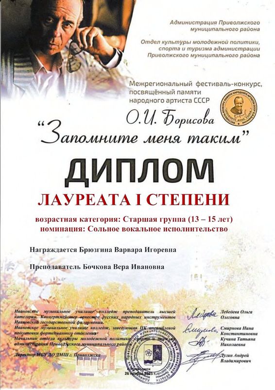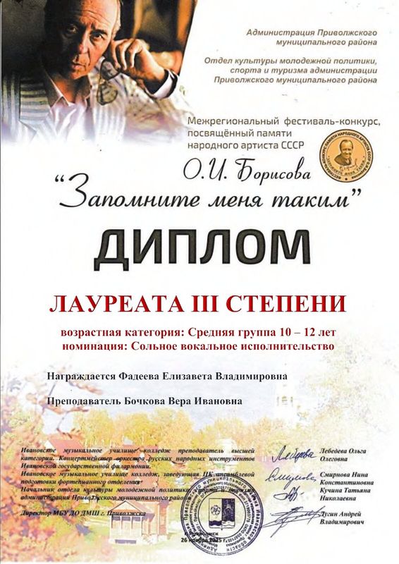 26 ноября учащиеся Детской школы искусств приняли участие в Межрегиональном фестивале-конкурсе, посвященного памяти народного артиста СССР О.И. Борисова «Запомните меня таким…» в городе Приволжск.