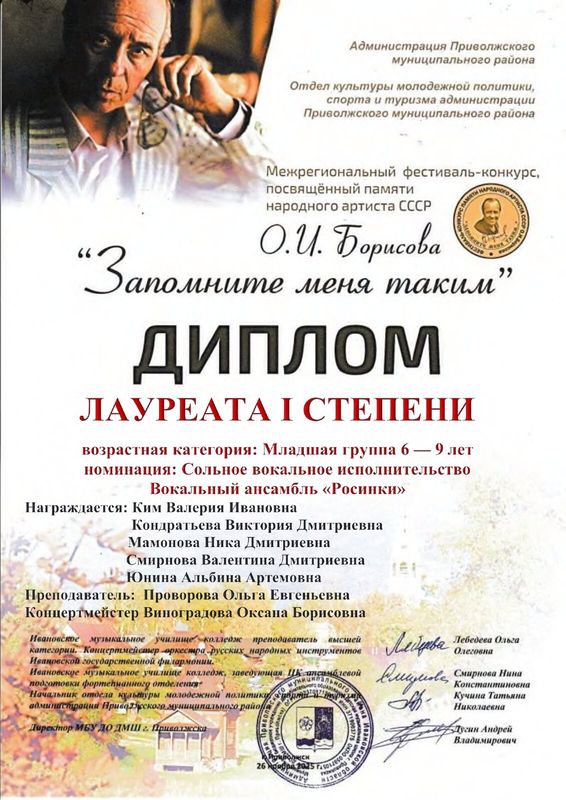 Вокальный ансамбль «Росинки» в составе: Смирнова Валентина, Кондратьева Виктория, Ким Валерия, Юнина Альбина, Мамонова Ника (преподаватель Проворова О.Е., концертмейстер Виноградова О.Б.) – лауреат 1 степени;