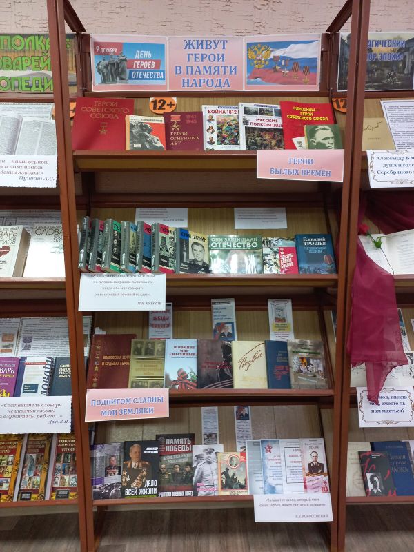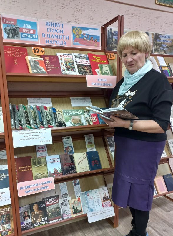 О наших героях-земляках можно узнать из буклетов и брошюр, выпущенных библиотекой: «Подвигом славны твои земляки» (о Герое Советского Союза, летчике Ю.И. Горохове), «Полководец, не проигравший ни одного сражения» (О дважды Герое Советского Союза А.М. Василевском), «Гроза фашистских «юнкерсов» (о Герое Советского Союза, летчике В.М. Беликове), «Да будет вечным мужество героев» (о Герое Советского союза А.В. Голоднове), «Под огнем пулеметного дзота» (о Герое Советского Союза Н.А. Вилкове), «Тебе, герой, всегда пусть будет светлой память» (о Ю.А. Аристове, участнике СВО, награжденном орденом Мужества (посмертно).