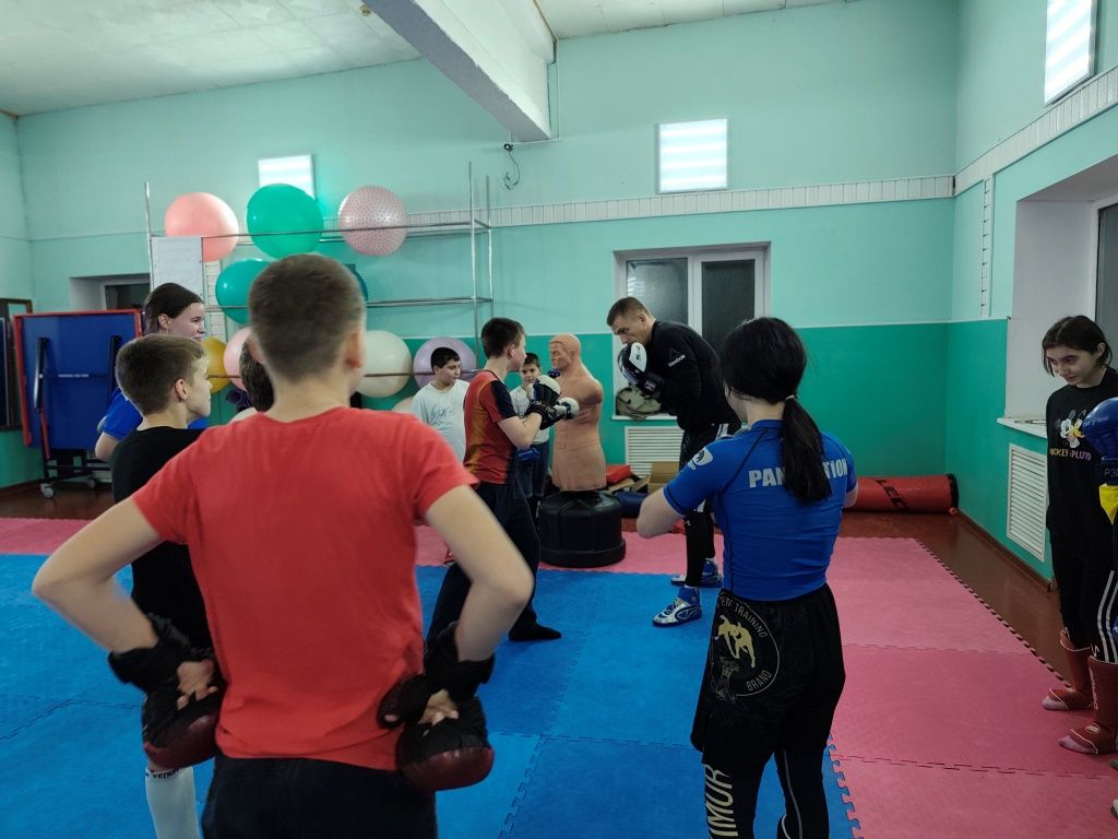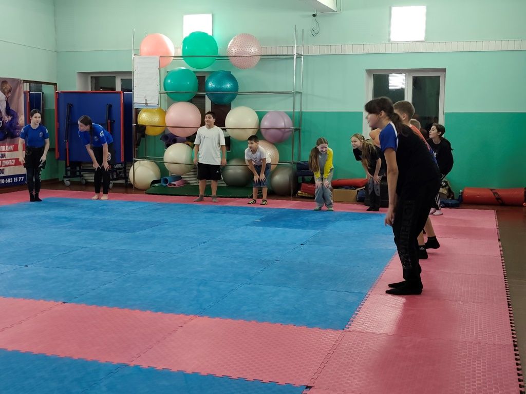 После разминки детям продемонстрировали несколько приемов, используемых в этом виде спорта: «бросок», «комбинация ударов «двойка», «удар ногой «лоу-кик». Новички быстро схватывали технику и выполняли все упражнения.