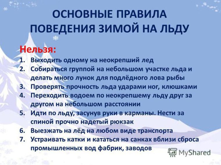 6) Нельзя выходить на лёд в тёмное время суток и при плохой видимости (туман, снегопад, дождь).
