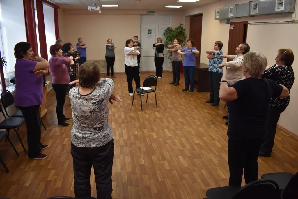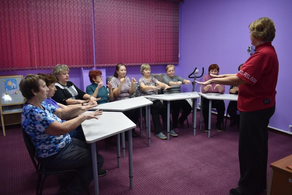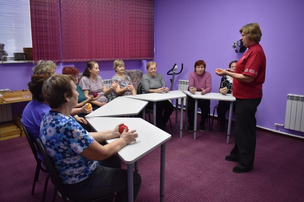 В рамках «Школы «серебряных» волонтеров» специалист по реабилитационной работе в социальной сфере Ирина Анатольевна Беликова провела с участниками группы комплекс занятий в рамках социального проекта «Мозг в тонусе». В ходе занятия была проведена гимнастика для рук с массажным шипованным мячом «Су-джок», комплекс упражнений для суставов рук и развития мелкой моторики, участники выполнили музыкально-ритмические упражнения «Боди перкуссия». В завершении занятия была проведена расслабляющая релаксация, сопровождающаяся показом видео-ролика.