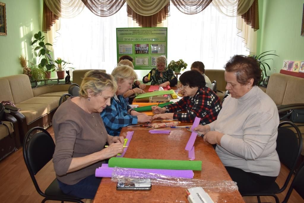 Затем участники группы совместно со специалистом по социальной работе Мариной Валерьевной Любимовой в рамках творческого клуба «Декупаж» начали изготовление тюльпанов из гофрированной бумаги, для оформления сувениров на 8 Марта получателям социальных услуг отделения социального обслуживания на дому.