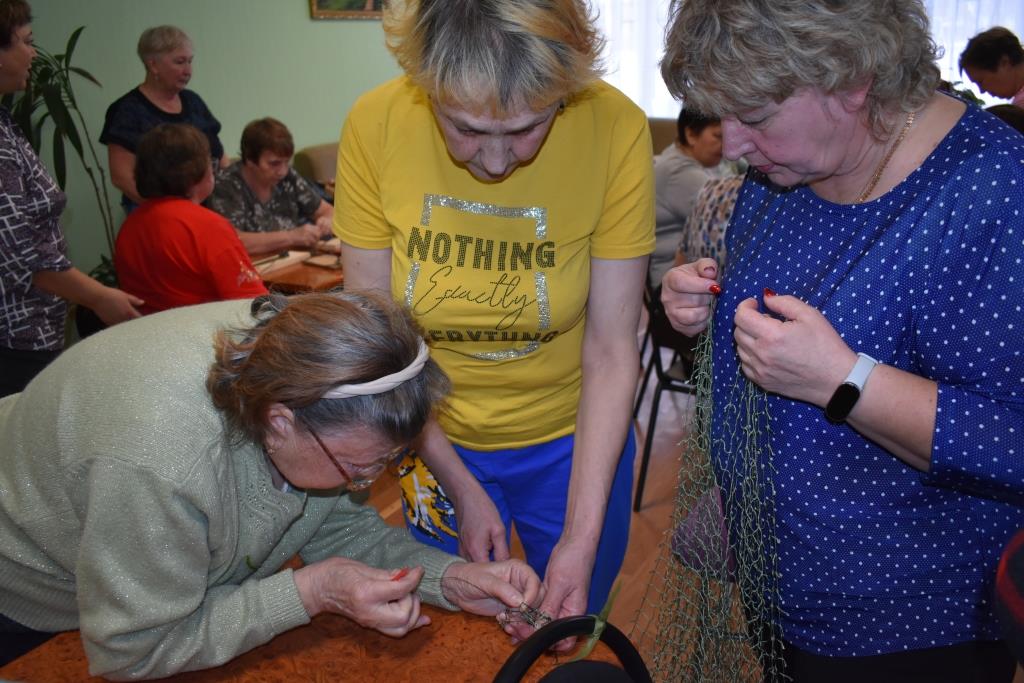 Галина Петровна Догадкина и Галина Константиновна Родионова показали технику соединения сетевых лоскутов в одно полотно. За помощью в изготовлении этих полотен обратились волонтеры маскировочного центра «СВОих не бросаем» г. Иваново, с которыми тесно сотрудничает ОБУСО «Заволжский ЦСО». Петелька за петелькой волонтеры трудились над непростой задачей.