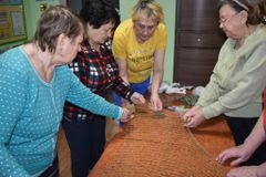 Галина Петровна Догадкина и Галина Константиновна Родионова показали технику соединения сетевых лоскутов в одно полотно. За помощью в изготовлении этих полотен обратились волонтеры маскировочного центра «СВОих не бросаем» г. Иваново, с которыми тесно сотрудничает ОБУСО «Заволжский ЦСО». Петелька за петелькой волонтеры трудились над непростой задачей.
