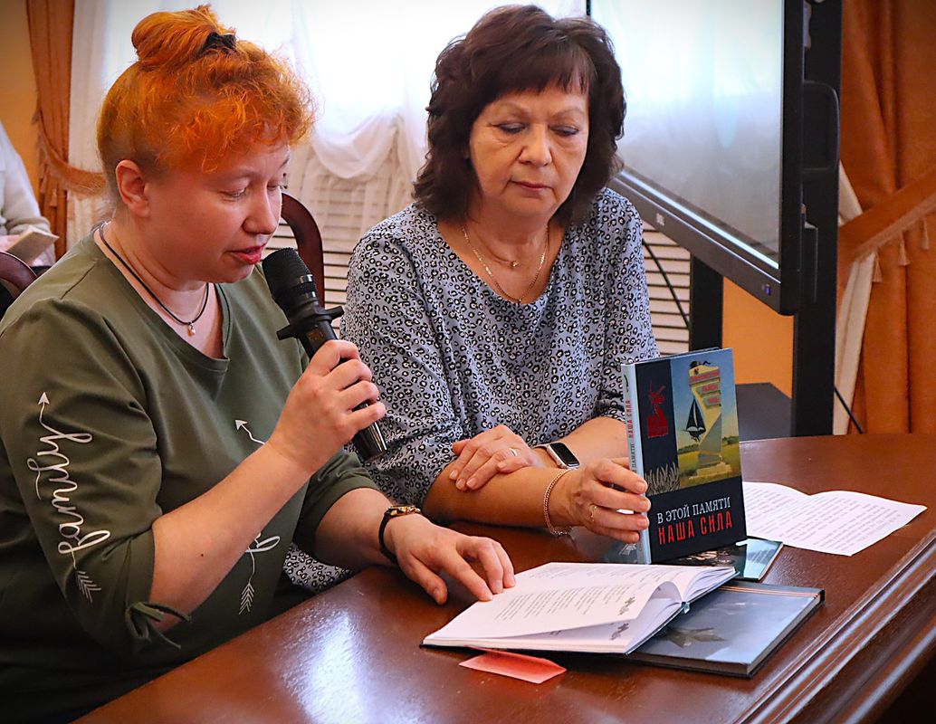 Надежда Викторовна Петриченко, заведующая организационно-методическим отделом Заволжской городской библиотеки, представила сборник стихов заволжских поэтов «В этой памяти наша сила» и прочитала стихотворение Сергея Обидиентова «Пылили танки по дороге...».