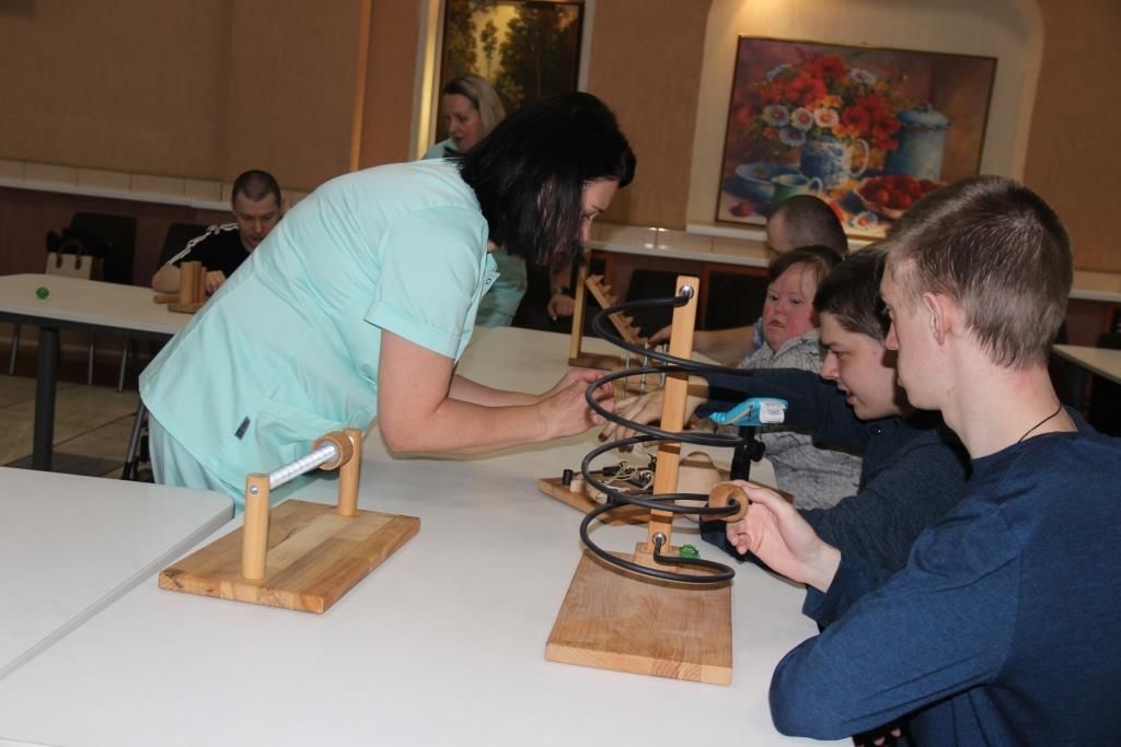 После снятия напряжения психолог и реабилитологи дома-интерната организовали комплексное занятие по механотерапии, направленное на восстановление двигательной активности и улучшение кровообращения. В начале сеанса специалисты использовали методику Су-Джок для массажа рук, что способствовало расслаблению мышц, нормализации нервного возбуждения и повышению общей чувствительности конечностей. Затем участники приступили к работе на тренажёрах. Регулярные занятия такого типа очень важны, они помогают не только укрепить мускулатуру, но и ускоряют процесс реабилитации после периодов ограниченной подвижности.