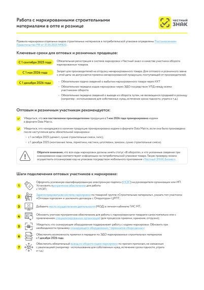 В целях заблаговременной подготовки к работе с маркированными строительными материалами, ООО «Оператор-ЦРПТ» настоятельно рекомендует оптовым и розничным организациям: