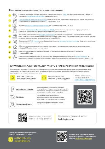 • Зарегистрироваться и подключить в личном кабинете системы маркировки «Честный знак» товарную группу «Строительные материалы»: Видеоинструкция по регистрации clck.ru/3CDdfv