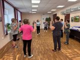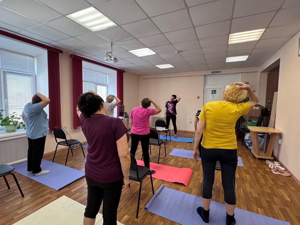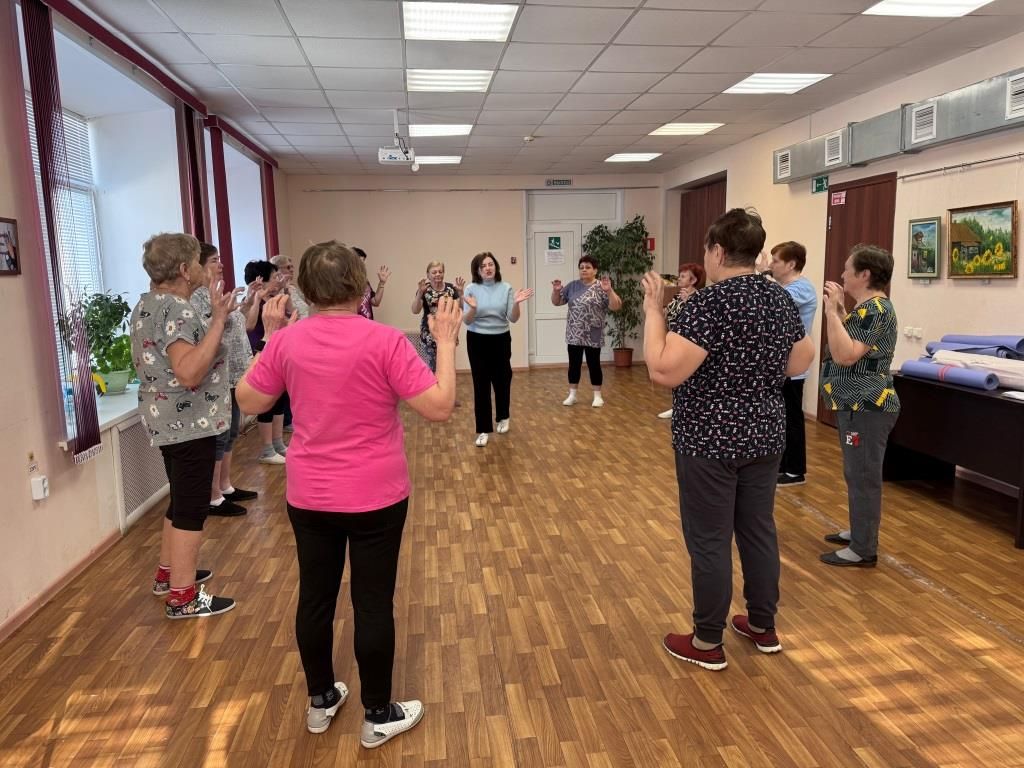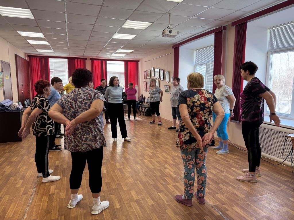 Спортивное занятие началось с дыхательной гимнастики Стрельниковой, которую провела Светлана Зотикова, сотрудник МКУК «Заволжский ГДК». Участники прошли круг упражнений по 32 повтора. Дыхательная гимнастика Стрельниковой может быть полезна для пожилых людей в случаях, связанных с проблемами дыхательной системы и снижением физической активности.