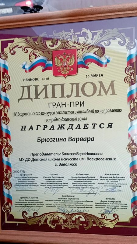 Учащаяся Детской школы искусств Варвара Брюзгина (преподаватель Бочкова Вера Ивановна) завоевала Гран-При в номинации "Эстрадный вокал". Это заслуженная награда за ее упорный труд, яркий талант и невероятную харизму на сцене. Мы гордимся Варварой и желаем ей дальнейших творческих успехов!