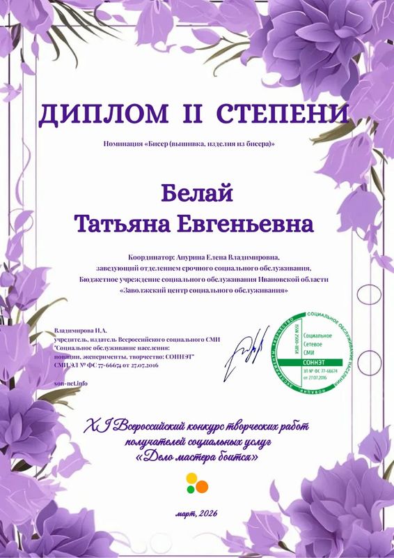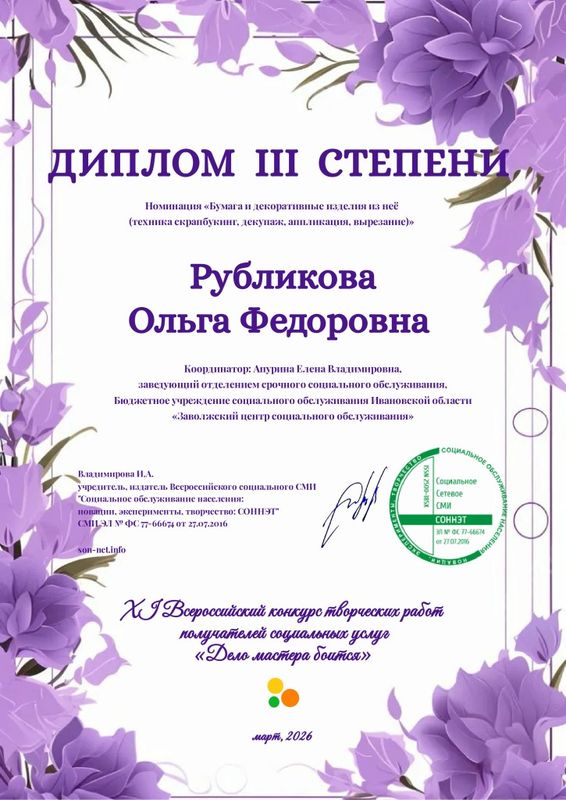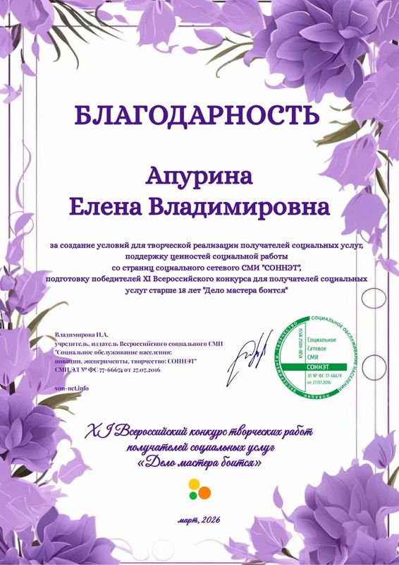 В начале апреля эксперты информационно-образовательного электронного журнала для работников социальной сферы «СОННЭТ» завершили оценку работ XI Всероссийского конкурса творческих работ граждан пожилого возраста и лиц с инвалидностью «Дело мастера боится».