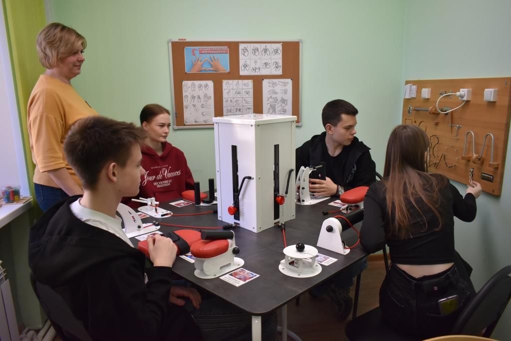 О том, как проводится работа с молодыми инвалидами и с людьми с ограниченными возможностями рассказали Оксана Борокина, заведующая отделением социальной реабилитации инвалидов, и Ирина Беликова, специалист по реабилитационной работе в социальной сфере. Они показали ребятам реабилитационное оборудование, которое используется в нашем центре.