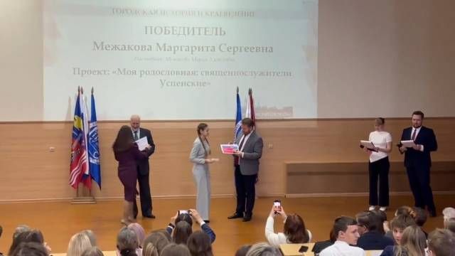 Межакова Маргарита была награждена дипломом победителя Олимпиады "Большие надежды малых городов" по тематическому направлению "Городская история и краеведение". Рита получила подарочный сертификат в сеть книжных магазинов "Читай-город" и гарантированные дополнительных баллов к ЕГЭ при поступлении в вузы консорциума "Иваново".