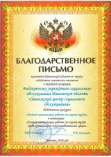 Учреждению вручено Благодарственное письмо комитета Ивановской области по труду, содействию занятости населения и трудовой миграции, являющегося организатором конкурса.