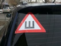 На основании п. 7.15.1 введённого Постановлением Правительства РФ от 24.03.2017 N 333, на задней части транспортного средства, у которого установлены шипованные шины, должен быть размещён знак «шипы» в виде равностороннего треугольника белого цвета вершиной вверх с каймой красного цвета, в который вписана буква "Ш" черного цвета (сторона треугольника не менее 200 мм, ширина каймы - 1/10 стороны).